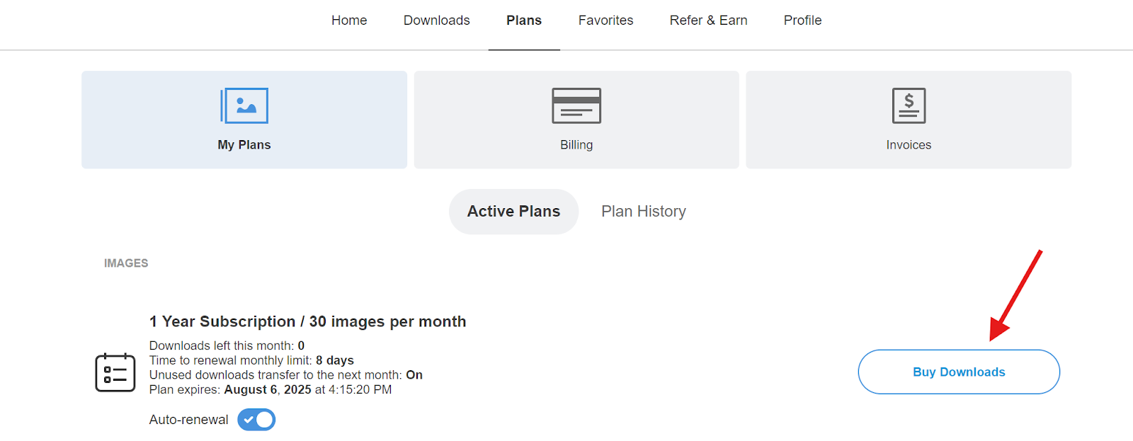 - From the Home page: Go to Home -> Plans and click the “Buy Downloads” button.