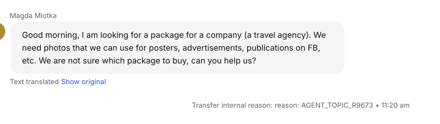 Step 1: I’d be happy to help you find the best stock image solution for your company. Based on your needs, the Standard Business License is the most suitable. You can view our B2B plans here: [link]. Step 2: Will the images be used primarily for social media, or also for ads, websites, or print? Step 3: Could you please share your company name, email, and phone number so our Sales team can prepare a personalized plan for you? Step 4: Thanks! I’ve passed your info to the Sales team. They’ll get back to you within one hour with your custom offer and a link to buy. |