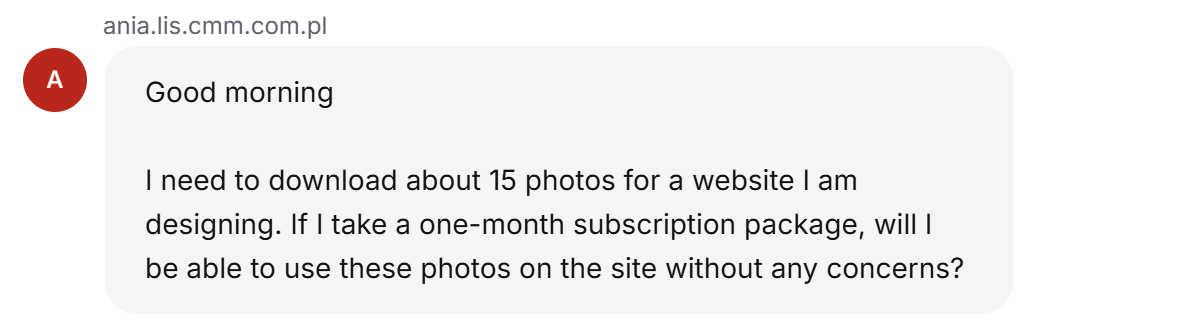 Step 1: Sure, you can choose a plan with a fixed number of downloads per month or year. Subscriptions are more affordable and don’t require an annual commitment. How many images do you need per month? Step 2: Step 3: Thanks for sharing! Could you please share your company name, email, and phone number so our Sales team can prepare a personalized plan for you? Step 4: Thanks! I’ve passed your info to the Sales team. They’ll get back to you within one hour with your custom offer and a link to buy. |
